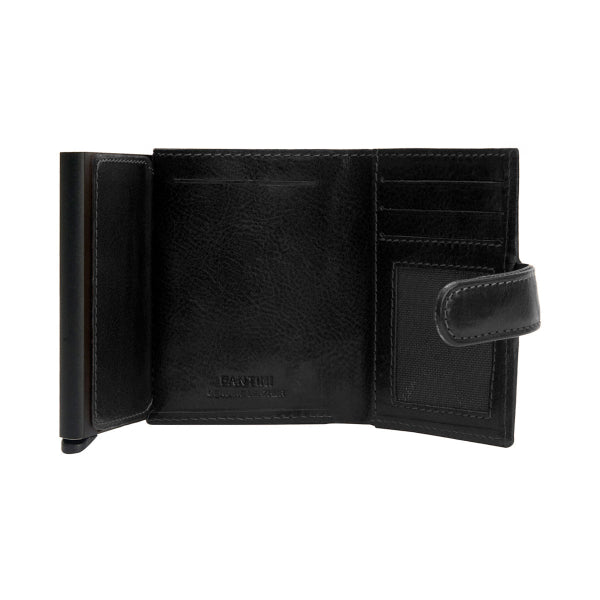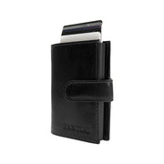 Das integrierte Aluminiumgehäuse mit Pop up System ermöglicht es, die Karten per Knopfdruck übersichtlich herauszuschieben. Der verbaute RFID Schutz verhindert das ungewollte Auslesen sensibler Kartendaten. Ein Druckknopfverschluss sorgt dafür, dass alles sicher verstaut bleibt.