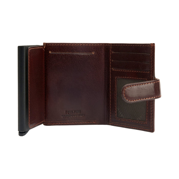 Fantini Palletteria Pop-Up Cardholder, elegant, sicher und klar im Design präsentiert sich der Kartenhalter in Dunkelbraun. Er richtet sich an alle, die einen klassischen Auftritt mit modernen Funktionen verbinden möchten.