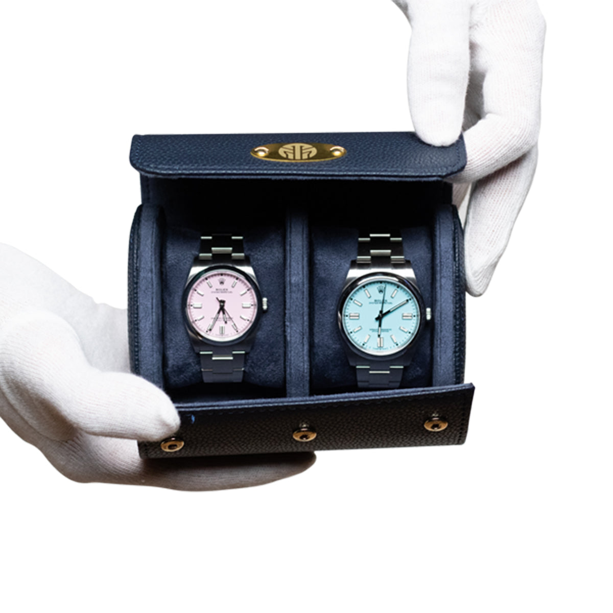 This GTP 2-Way watch roll is designed to fit two watches in it's stunning Deep Sea Blue. All cushions use an easy snap button system which makes it effortless to store your watch in the roll. The 2-Way watch roll is a perfect tool to showcase and protect your beloved watches in an elegant way.