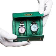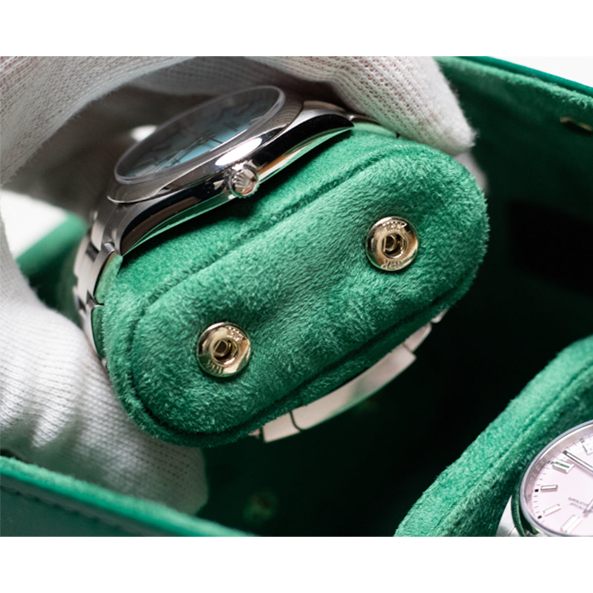 This GTP 2-Way watch roll is designed to fit two watches in it's stunning Greenkeeper Green. All cushions use an easy snap button system which makes it effortless to store your watch in the roll. The 2-Way watch roll is a perfect tool to showcase and protect your beloved watches in an elegant way.